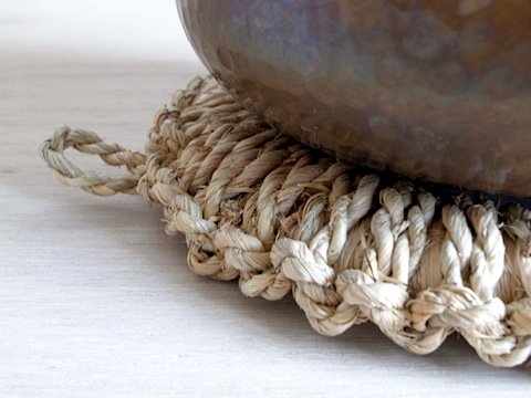 新潟県・佐渡島で職人さんたちが編み上げているワラの鍋敷き。ドーナツのように真ん中があいているので、底が丸いお鍋でも安定します。使わない時は壁にかけて収納できます。