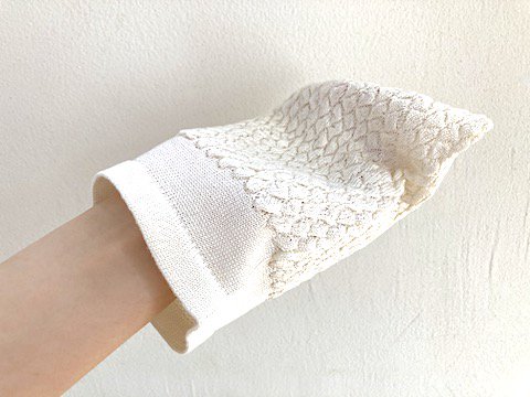 手にすっぽりとはめて使えるシルクのバスミトンです。使われている最高級絹糸は、無農薬の桑畑から生産された生糸に、一般的な工程では溶け出してしまう潤い成分の多く入った絹糸を、特殊撚糸(ねんし)加工でコーティングされています。肌に吸収性が高く、保湿を必要としている皮膚に的確に吸収され、肌表面だけではなく肌の奥まで潤いを与えて細胞を活性化します。肌の汚れや古い角質も適度に除去、触れているだけで肌が潤い、新陳代謝を促す効果があるため、デリケートな赤ちゃんの肌やアレルギー肌に優しく機能し、潤いを与えます。