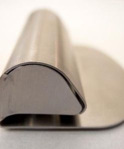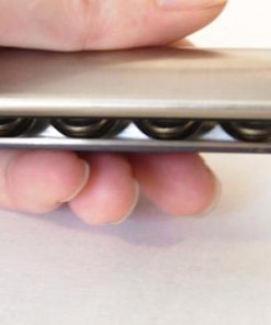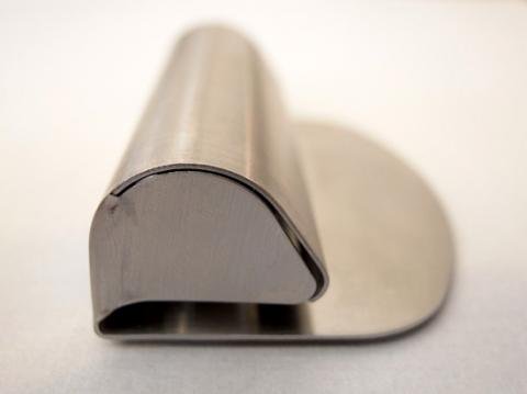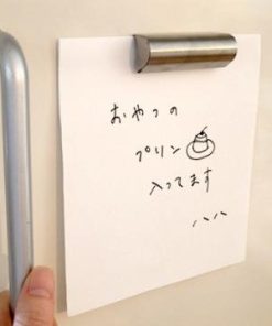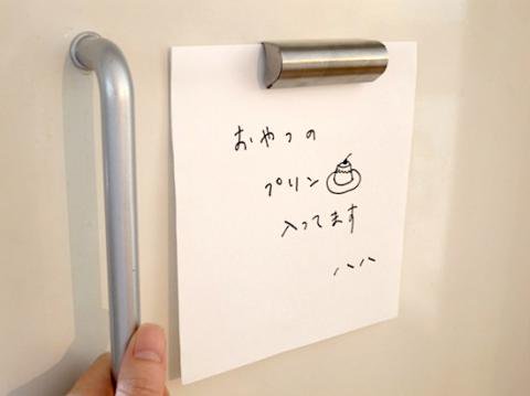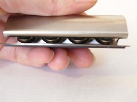ステンレス製のペーパークリップの中には、パチンコ玉の親分のようなボールが4つ並んでいます。バネを使わず紙にかかる重力を活かした単純構造。メモ用紙一枚でも、少し厚手の紙でも(通常のコピー用紙なら5~6枚ぐらい)、片手でするっと気持ち良く留め外しできます。キッチンや厨房、写真の現像、医療現場など、水回りや薬品を用いる場所でも安全・清潔にご使用いただけます。