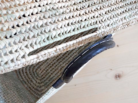 ヤシの葉を使って、ていねいに編み上げられたバスケットはモロッコから。持ち手には柔らかい皮革が巻かれて、荷物を持つ手にも腕にも優しい。旅行やお出かけでも、お家の中でも働き者の美しいかごです。Lサイズは旅行バッグとして最適なサイズ、マチが広くかさばるものも気持ち良く収まります。ホコリを被ってほしくないものや見えてほしくないもの、蓋つきっていいですよ。(写真一枚目:右からL・M・Sサイズ)