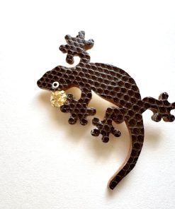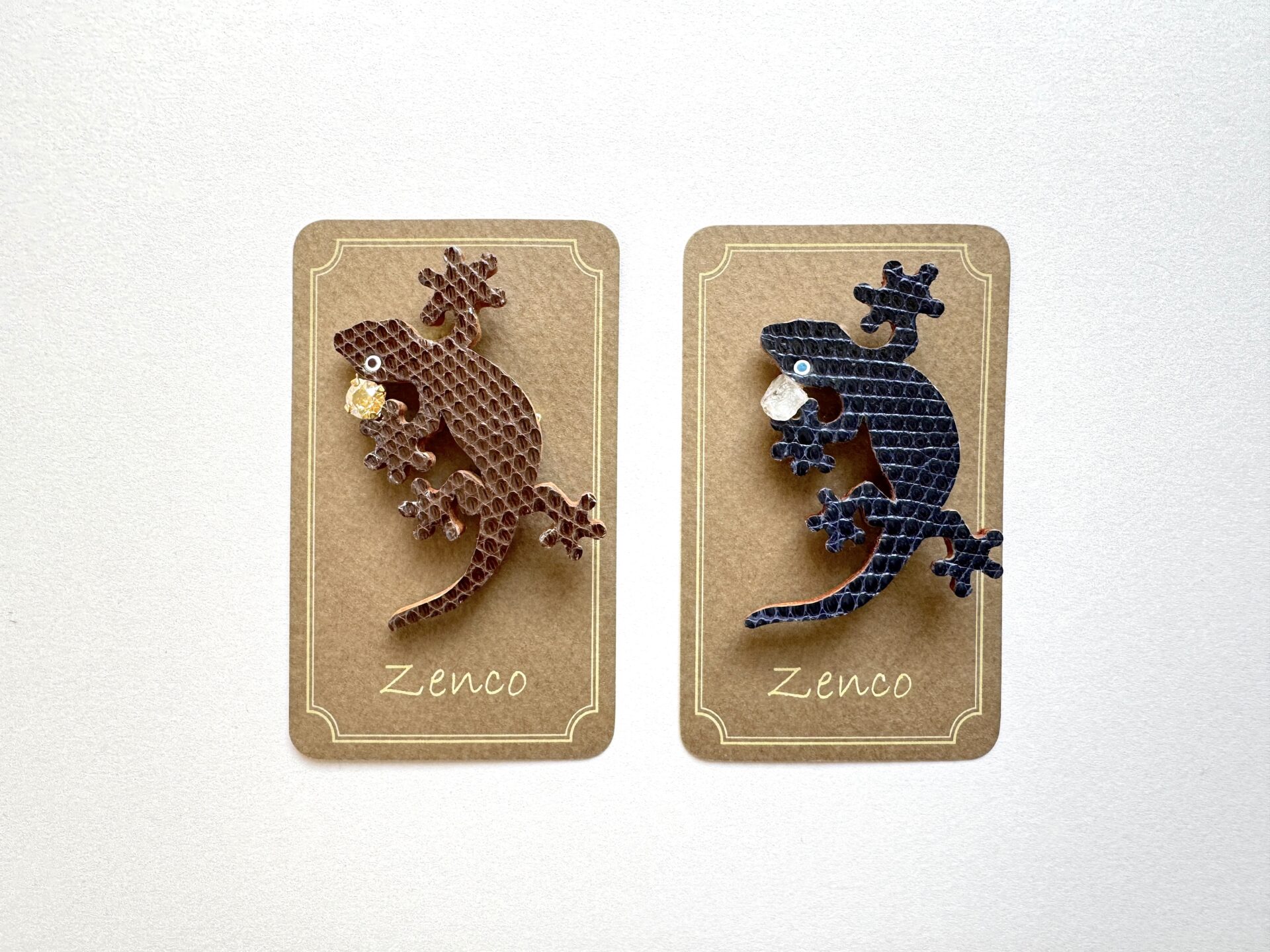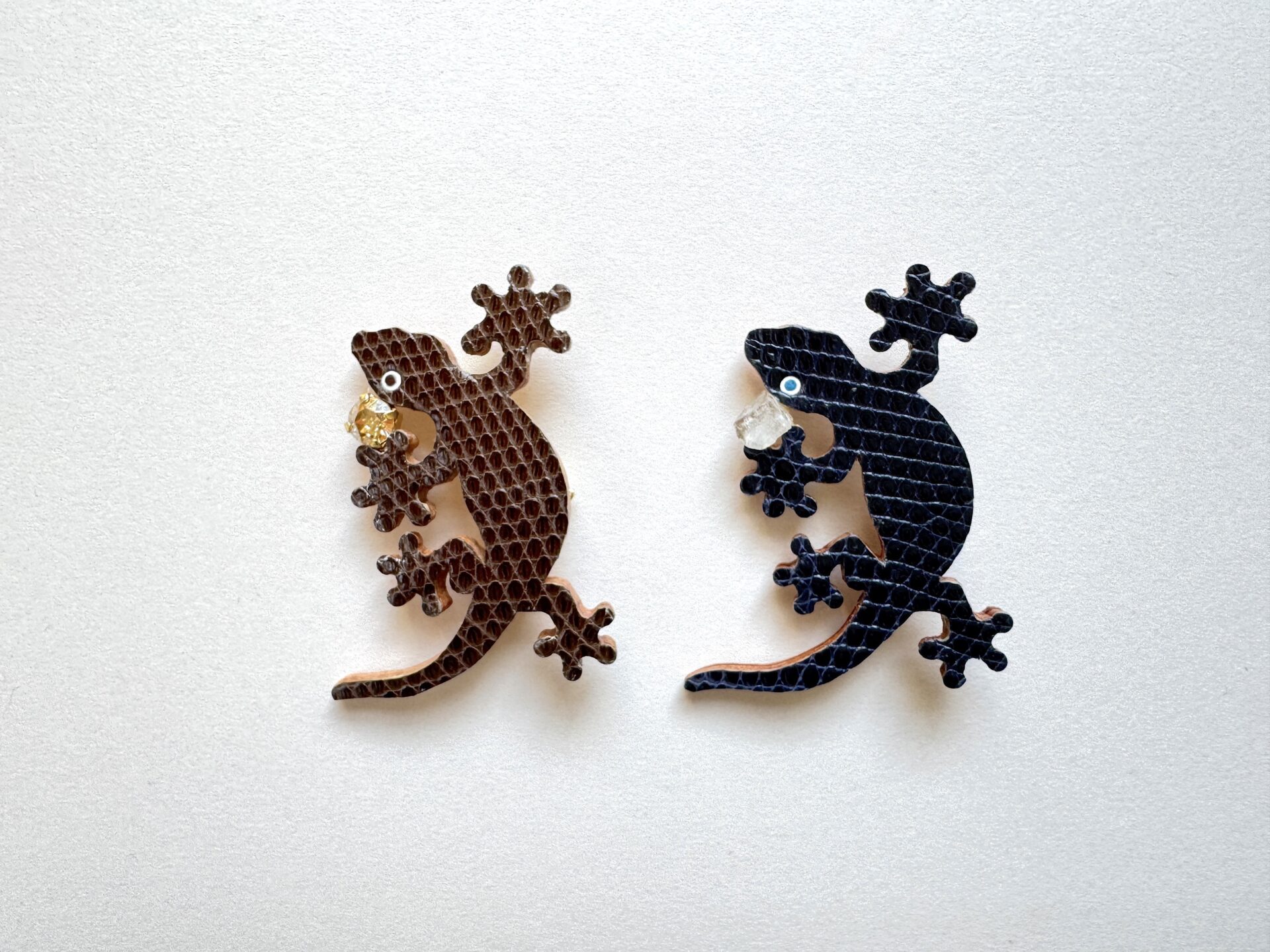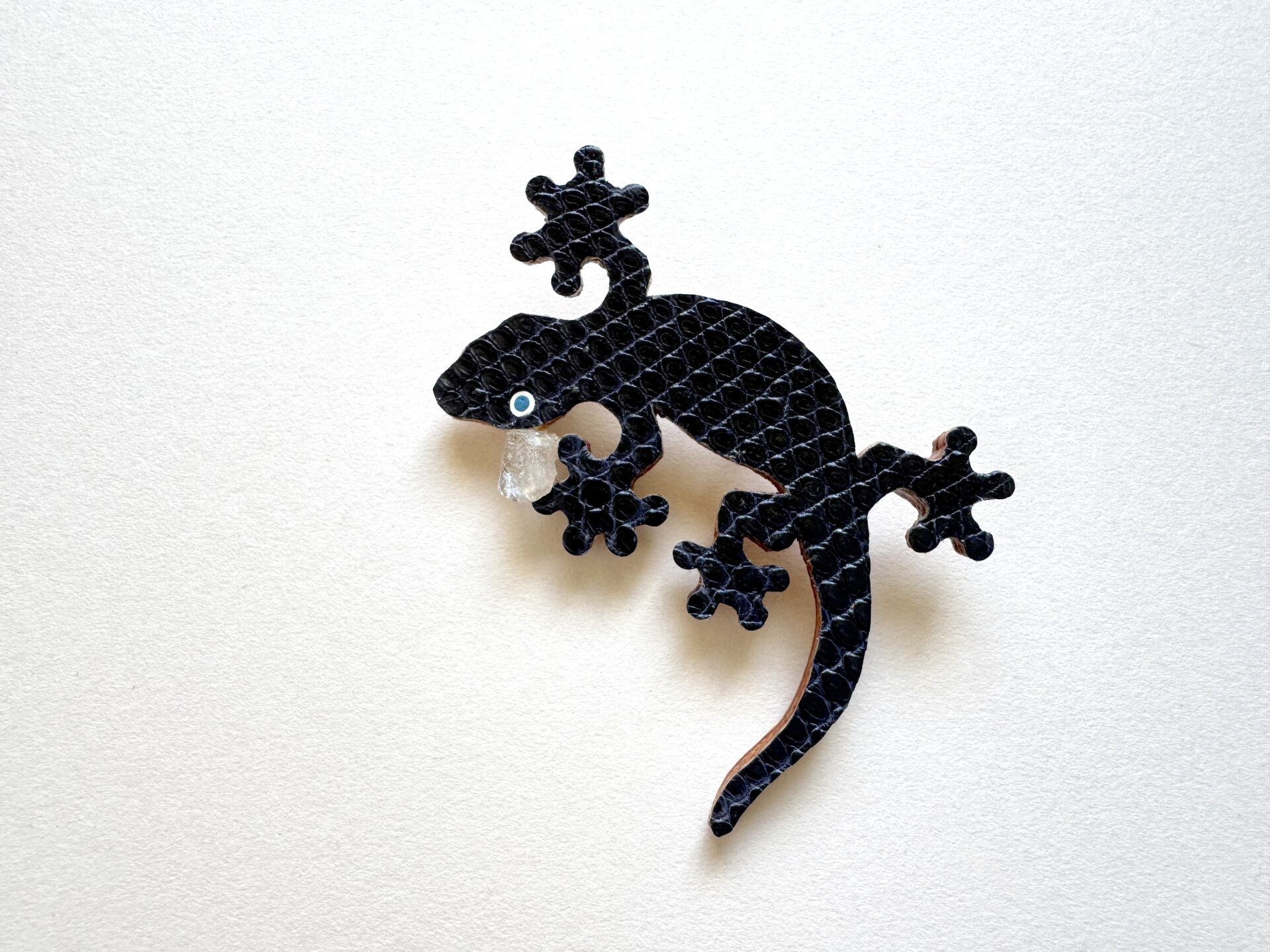 ヤモリは家を守ってくれる縁起のよい生き物だといわれています。庭の壁をささっと通りぬけるヤモリを見かけると、新しい季節を感じます。幸せを運んでくれるおたからを携えたヤモリのブローチです。
